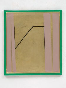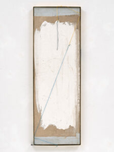Zickzack-Zickzack (7), Messing, Holz, Jute, Karton, Papier, Champagner-Kreidegrund, farbige Schnüre, 119,5 x 43,5 x 4,0 cm, 2018/2025