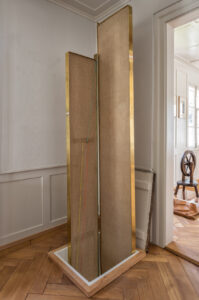 Spiegel, Neusilber, 1 mm Blech, poliert, dreifach kordierter Draht, hartgelötet, 144 x 70 cm, 2024